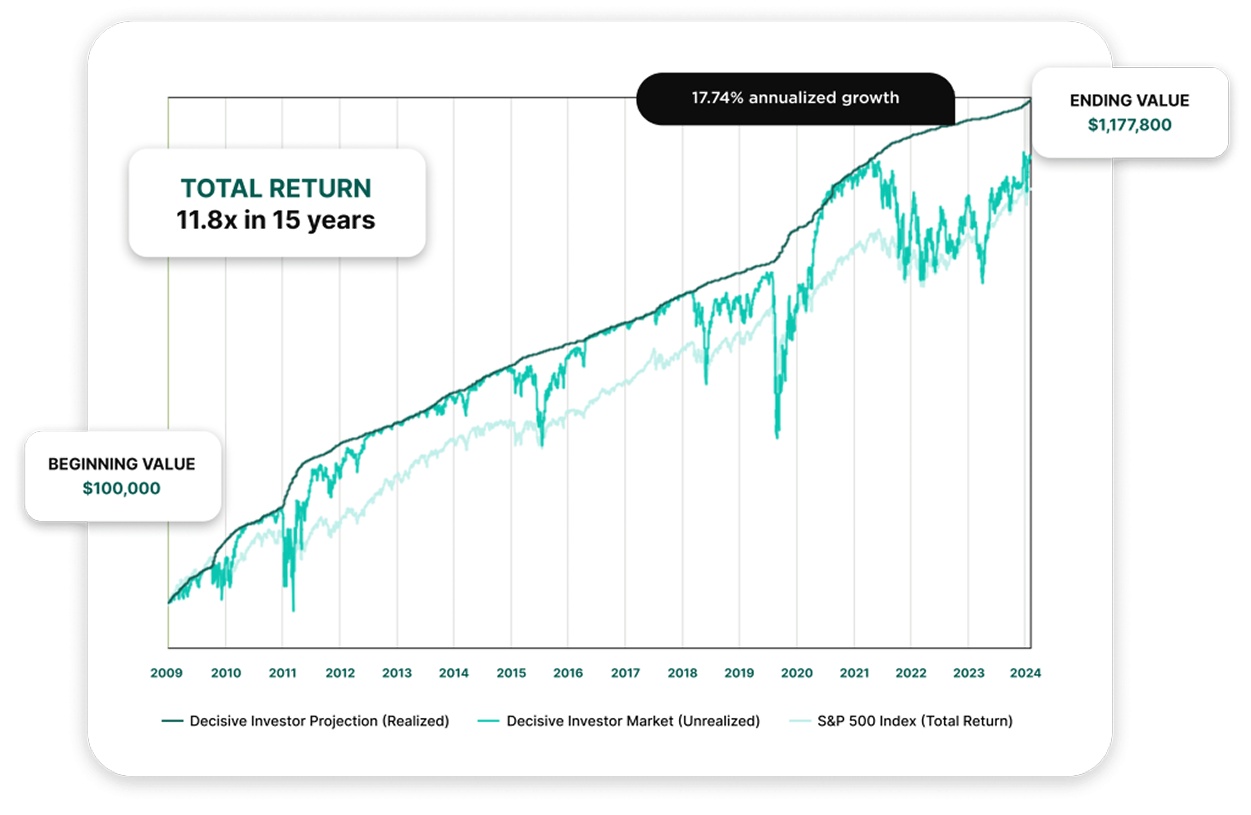 Starting with $100,000 in July 2009, this actual investor saw his initial investment grow more than 11.8x during the past 15+ years. This investor consistently profits from regular buying and selling by following Decisive Investor's trading block recommendations, even through market cycle declines.