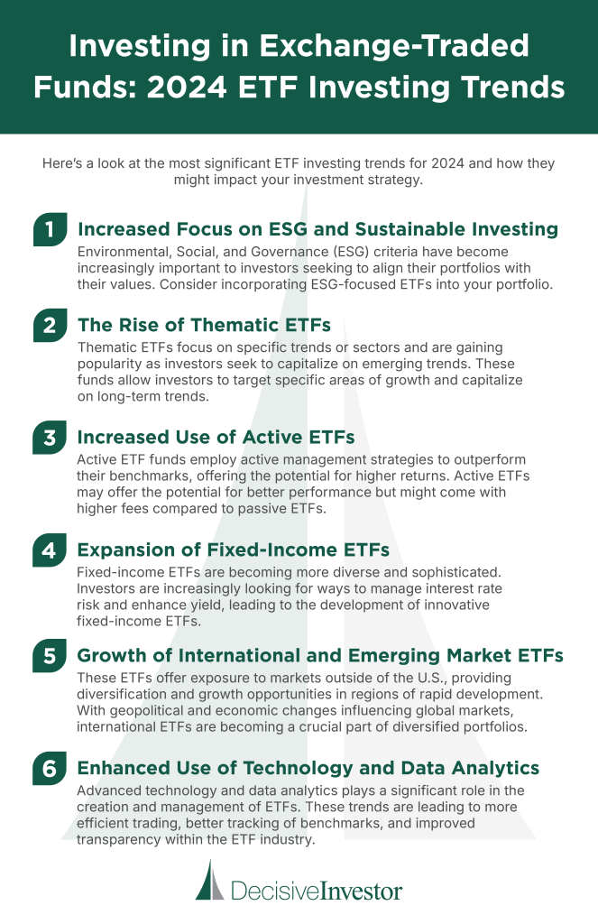 Investing in exchange-traded funds, the investment landscape in 2024 is characterized by innovation, diversification, and a growing focus on sustainability and technology. As you navigate these trends, it’s important to align your ETF investments with your financial goals, risk tolerance, and investment horizon. By staying informed and adapting to emerging trends, you can make the most of the opportunities offered by ETFs and build a resilient and dynamic investment portfolio.
